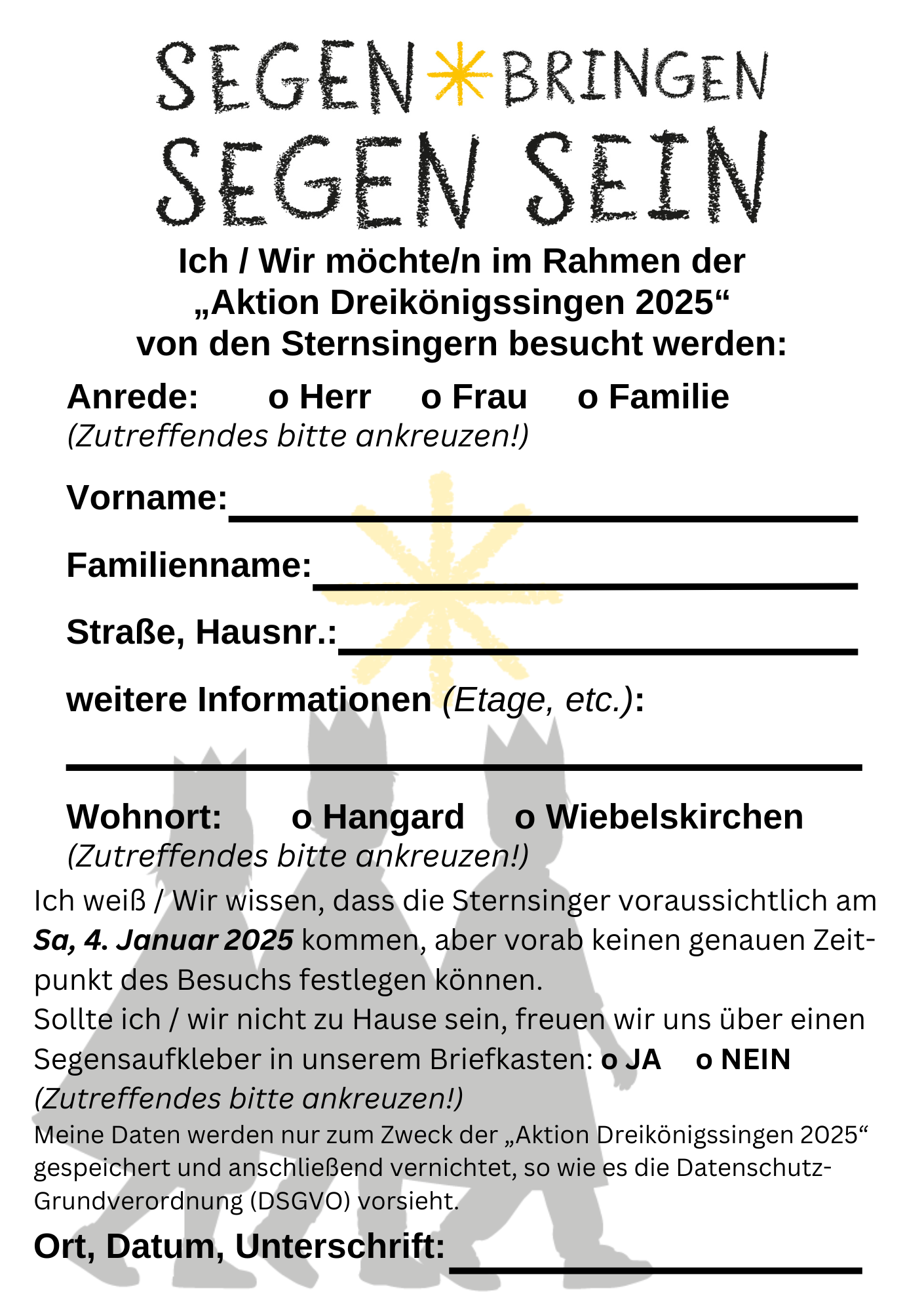 Wenn Sie den Besuch der Sternsinger wünschen, melden Sie sich dazu bitte in unserem Pfarrbüro an.
